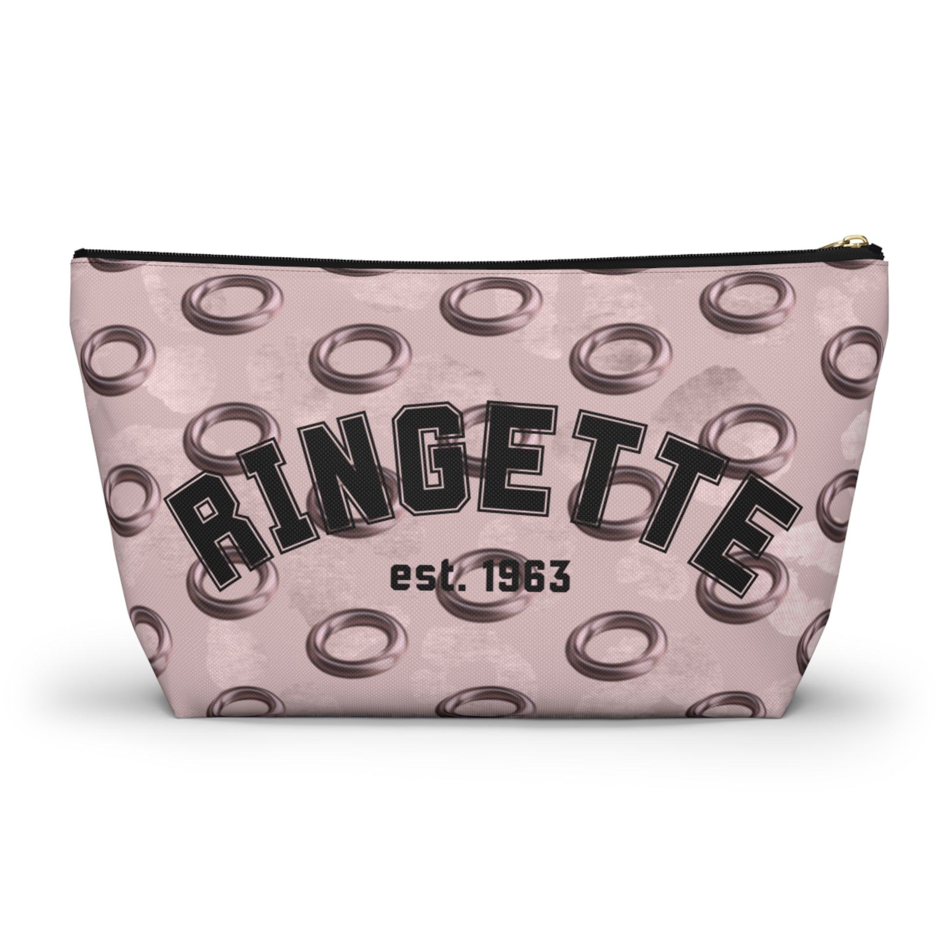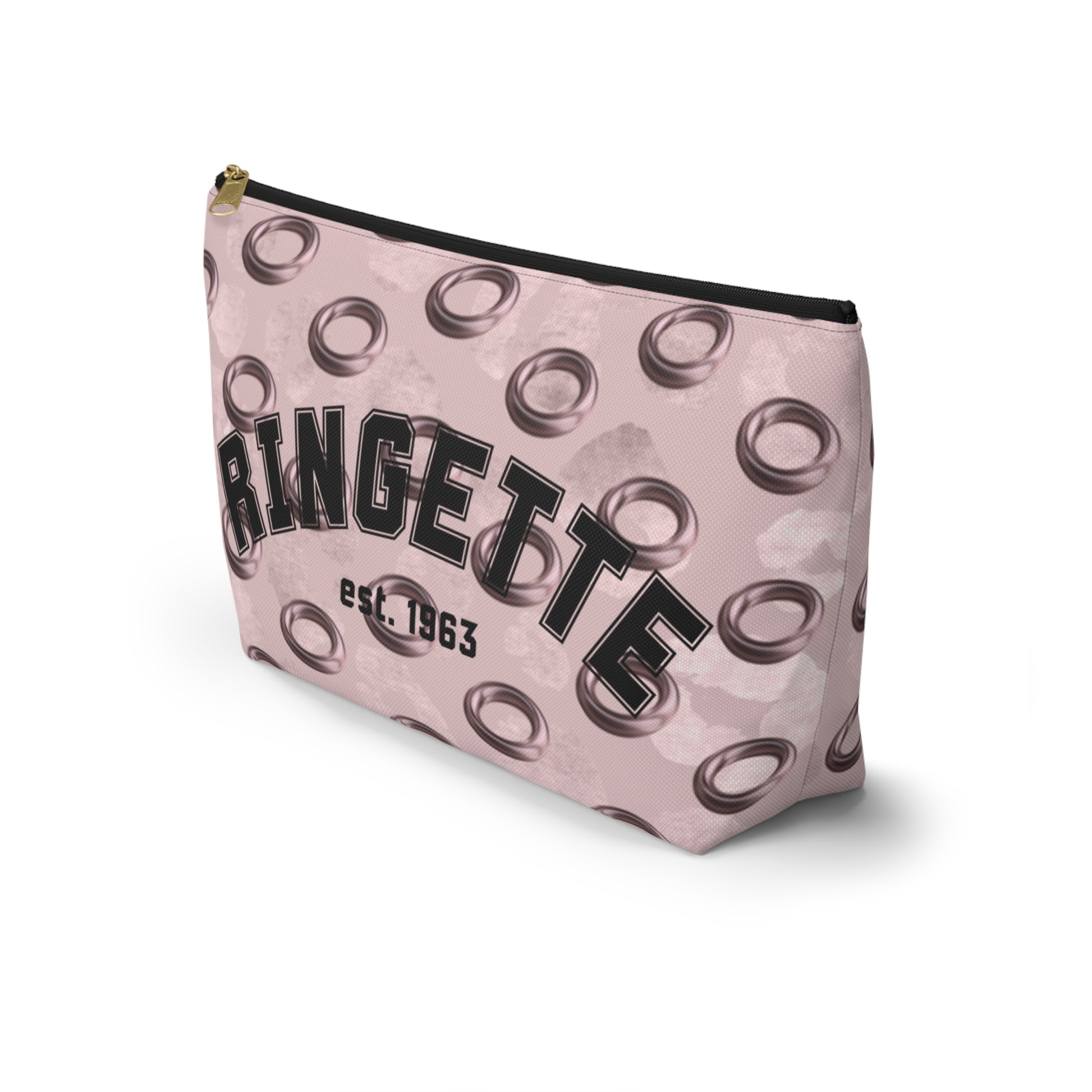 Soft spun polyester holds its shape and shows off crisp, vibrant printing of a repeating rose gold ring motif pattern and a retro 'Ringette est. 1963' design. The structured T-bottom gives the pouch extra capacity and a stable base on a vanity or bench. A matching durable zipper with a gold pull keeps contents secure, while the laminated interior adds light protection and easy cleaning.